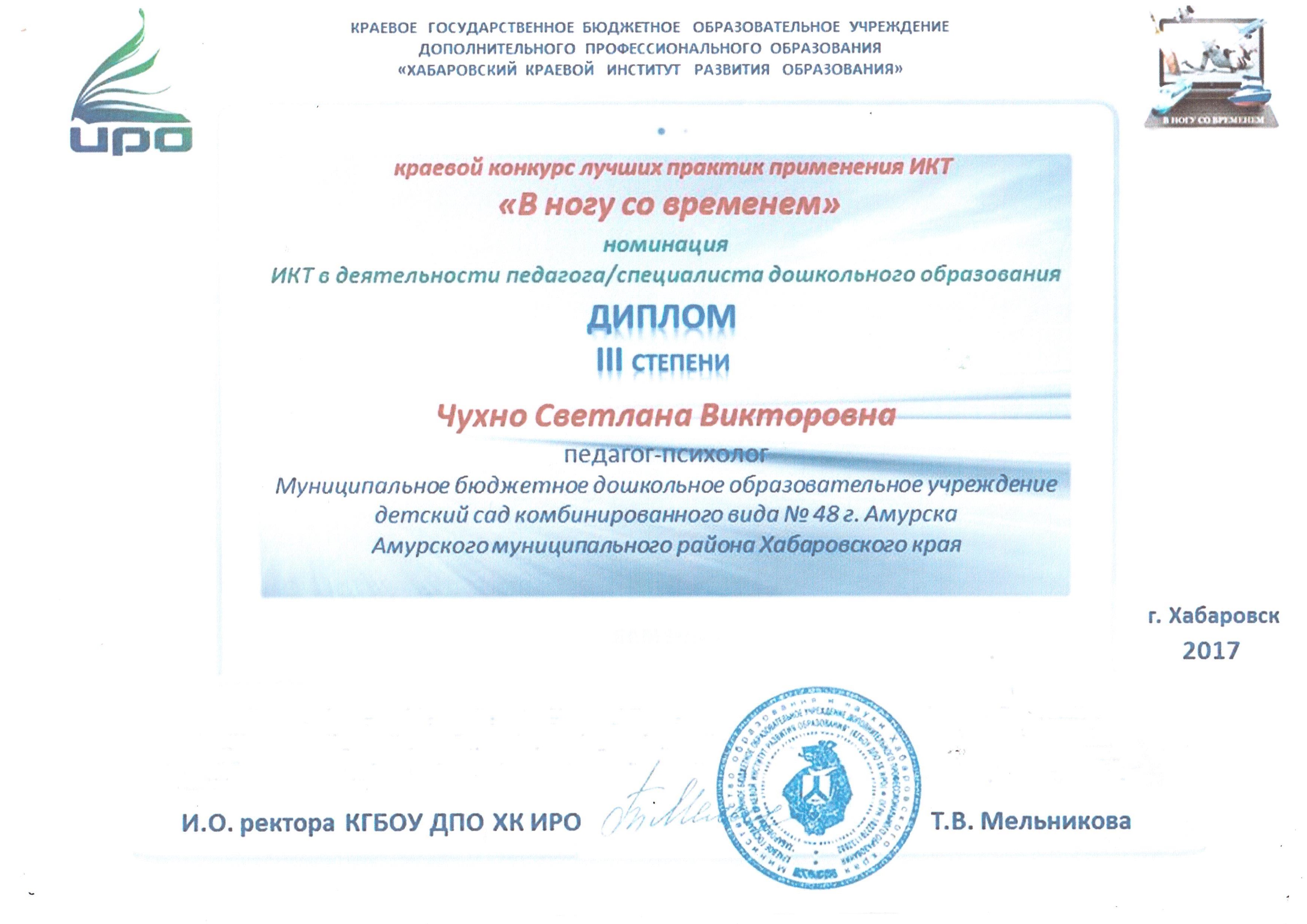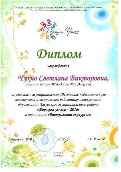 Диплом участника фестиваля педагогического мастерства и творчества работников дошкольного образования "Формула успеха - 2017" в номинации "Виртуальная экскурсия"