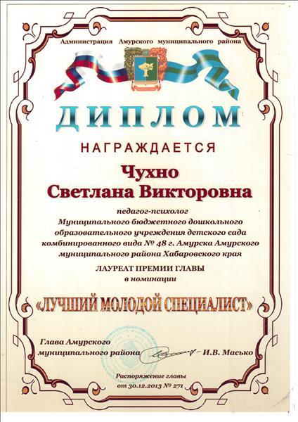 Диплом лаурета премии главы в номинации "Лучший молодой специалист"