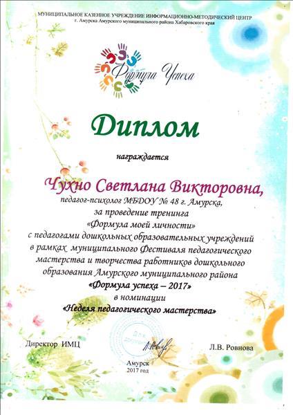 Диплом участника фестиваля педагогического мастерства и творчества работников дошкольного образования "Формула успеха - 2017" за проведение тренинга "Формула моей личности"