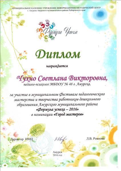 Диплом участника фестиваля педагогического мастерства и творчества работников дошкольного образования "Формула успеха - 2017" в номинации "Город Мастеров"