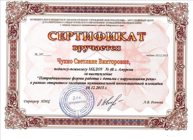 Сертификат информационного-методического центра за выступление "Нетрадиционные формы работы с детьми с нарушениями речи"
