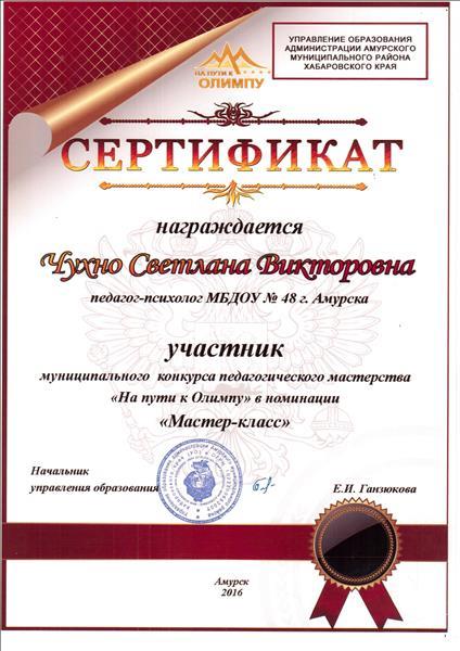 Сертификат участника муниципального конкурса педагогического мастерства "Ну пути к Олимпу" в номинации "Мастер-класс"