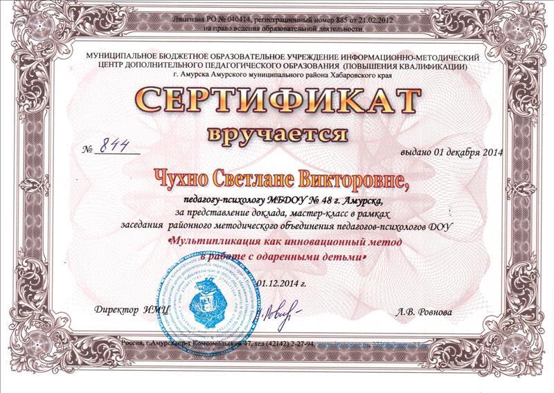 Сертификат информационного-методического центра за предоставление доклада "Мультипликация как инновационный метод в работе с одаренными детьми"