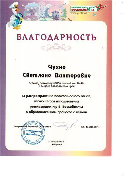 Благодарность ООО "Развивающие игры Воскобовича" за распространение педагогического опыта, касающегося использования развивающих игр Воскобовича в образовательном процессе с детьми"