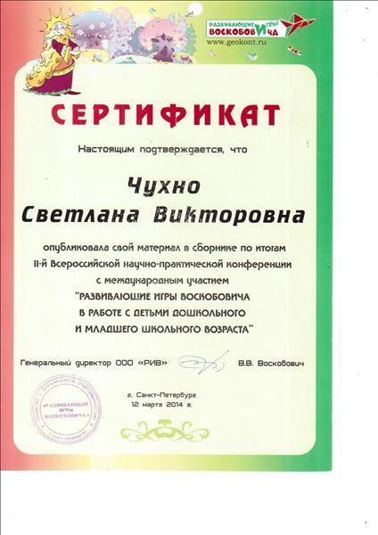 Сертификат о публикации материала во II Всероссийской научно-практической конференции с международным участием "Развивающие игры Воскобовича в работе с детьми дошкольного м младшего дошкольного возраста"