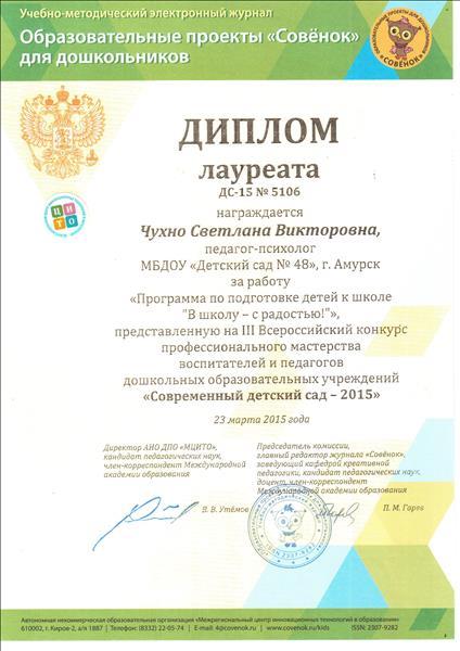 Диплом лауреата всероссийского конкурса профессионального мастерства воспитателей и педагогов "Современный детский сад - 2015"