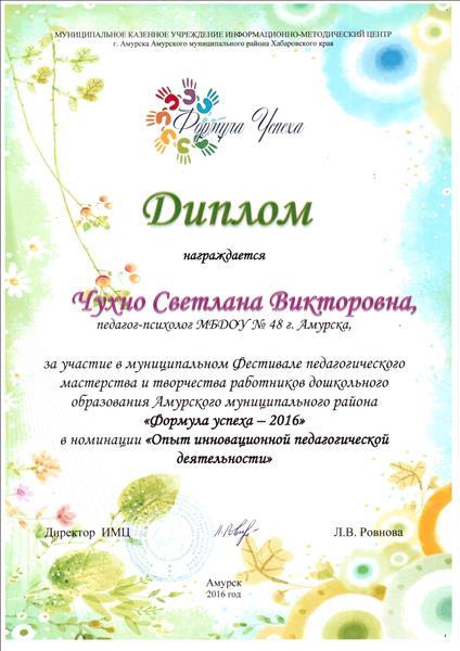 Диплом участника фестиваля педагогического мастерства и творчества работников дошкольного образования "Формула успеха - 2017" в номинации "Опыт инновационной педагогической деятельности"
