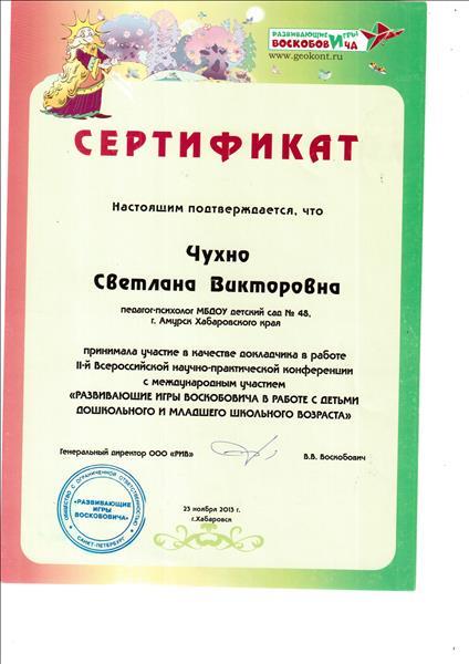 Сертификат участника во II Всероссийской научно-практической конференции с международным участием "Развивающие игры Воскобовича в работе с детьми дошкольного и младшего школьного возраста"