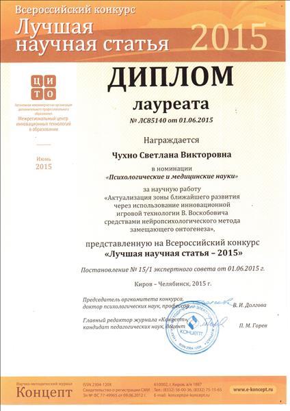 Диплом лауреата всероссийского конкурса "Лучшая научная статья - 2015" в номинации "Психологические и медицинские науки"