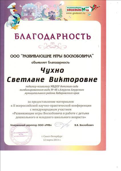 Благодарность ООО "Развивающие игры Воскобовича" за участие во II всероссийской научной конференции с международным участием "Развивающие игры Воскобовича в работе с детьми дошкольного и младшего школьного возраста"