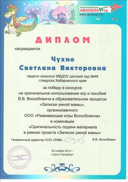 Диплом Развивающего центра В.В Воскобовича в номинации "Оригинальность подачи материала"