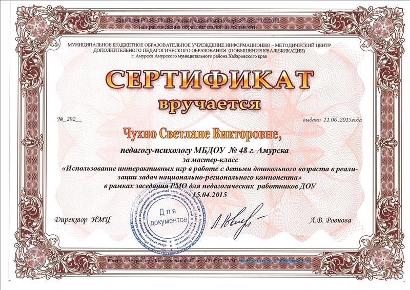 Сертификат информационного-методического центра за мастер-класс "Использование интерактивных игр в работе с детьми дошкольного возраста в реализации задач национально-регионального компонента"